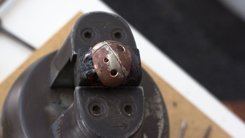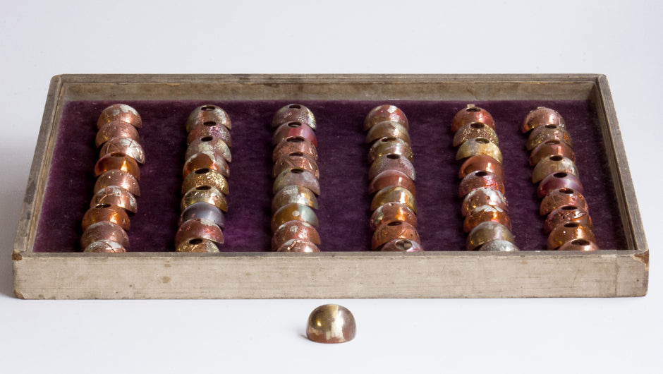 Minoru Takagi created 71 copper masks that are made to snap onto the MASK UAMOU figures, an additional 8 large masks for the GALAXY REAL UAMOU (hand painted by Master Goto) and 20 copper winged SERAPH MINI UAMOU. The masks are carefully handmade and hammered in to shape. Each mask features a different design and is either set with stones, decorated with hand chiselled patterns, treated with fire to give the copper different color hues or it features a combination of these techniques.