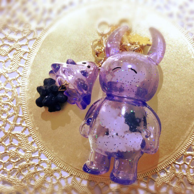 We have collaborated with Ame Ame, a studio that specialises in hand-made accessories based on candy and other sugary delights. The Ame Ame x Uamou collaboration figures come in a beautiful clear purple lamé body and are filled with colourful sugar candy (also known as konpeito). These Uamou will be available as figures and bag charms. A nice detail of the figures is that boo is connected to Uamou’s antenna with an earring that can be worn as a regular earring as well.