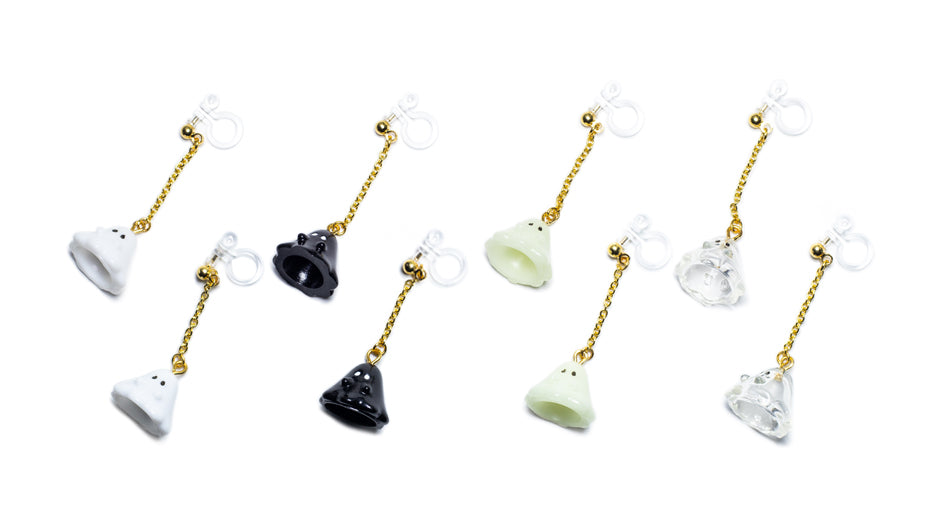 白、黒、蓄光、クリアの4色展開で、ウアモウとおばけちゃんのセットか、おばけちゃんペアかをお選びいただけます。耳に直接触れる装着部は樹脂製なので、金属アレルギーの心配も抑えられます。