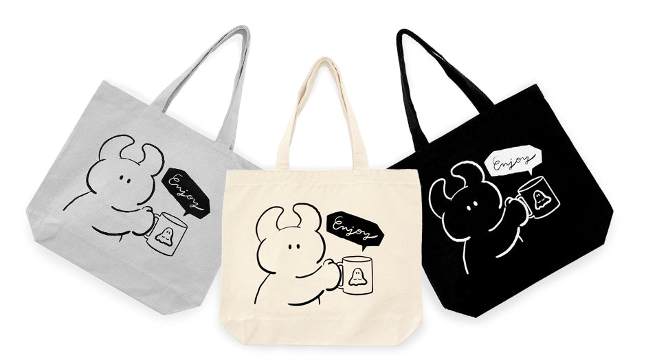 "Enjoy" tote bag is available in natural, light gray, and black at our online shop!