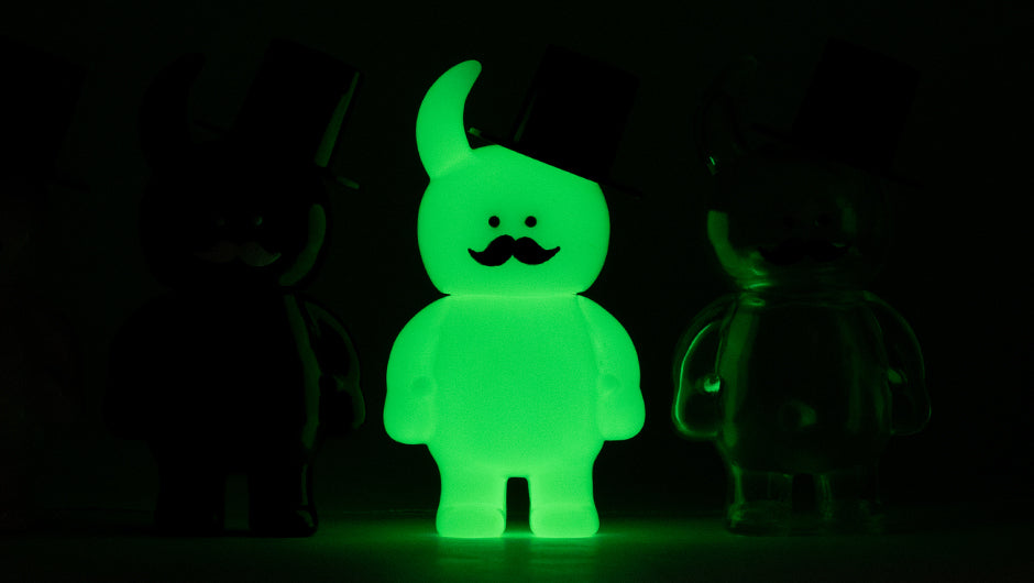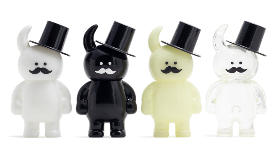 ラインナップは白・黒・蓄光・クリアの4種。立派なカイザー髭は高木綾子によるハンドペイントで、トップハットとのセットでお届けいたします。