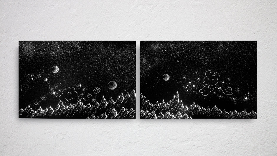 The two panels together create an impressive panorama featuring Mr, Nobody, Uamou and Boo set in a mysterious landscape and a star filled-sky.