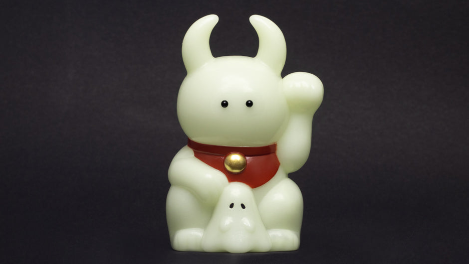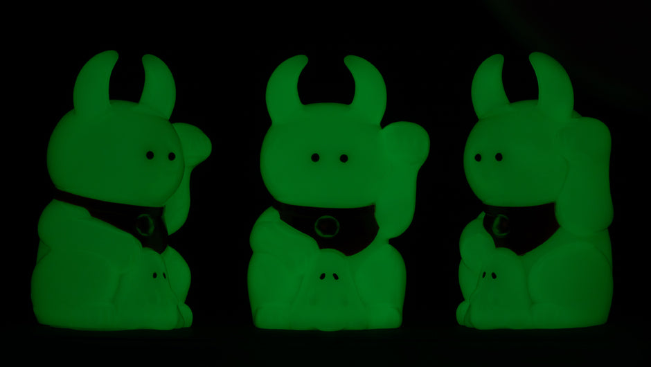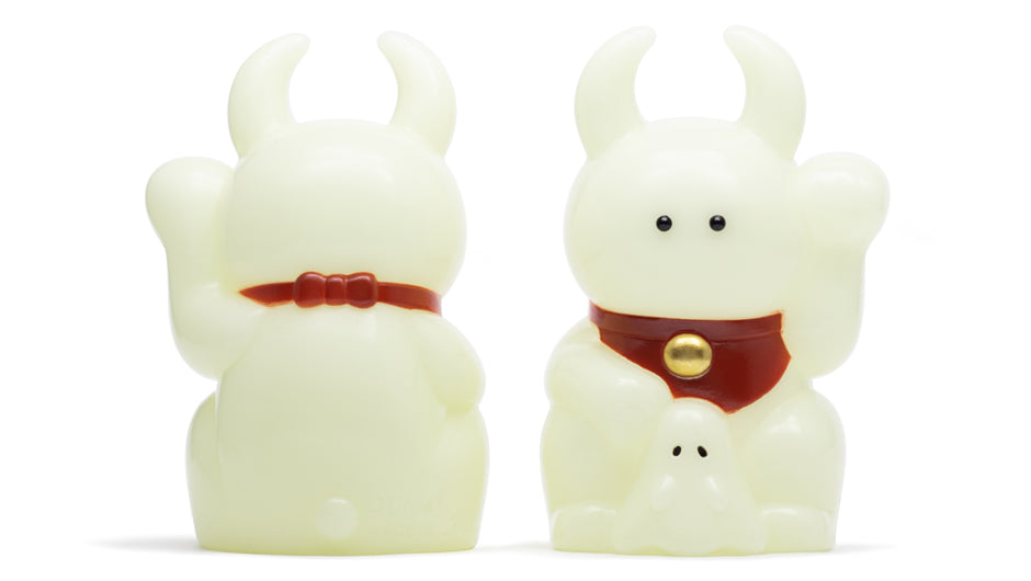 蓄光成型との色彩バランスを考慮した茶色の前掛けに、金色の鈴が輝きます。