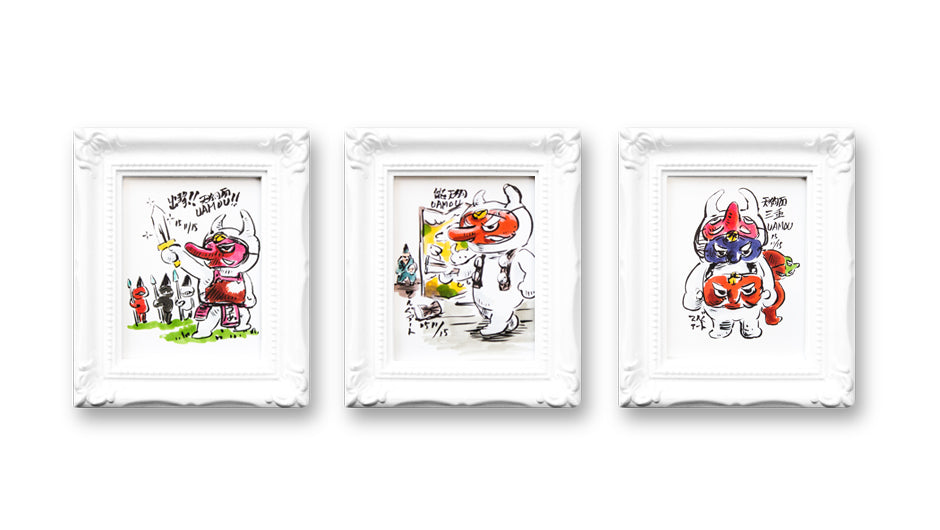 After an amazing opening, selling the first 2 batches within an instant, the “Uamou to Tengu to” Exhibition is well underway! After having announced an additional 3rd batch of Tengu Mask Uamou and an online sale to be held as soon as the exhibition is over, we would like to give a closer look at the Fukumen Tengu Uamou and the illustrated works by Tengu Arts that are on display this week as well.