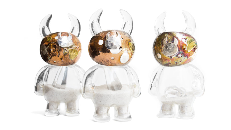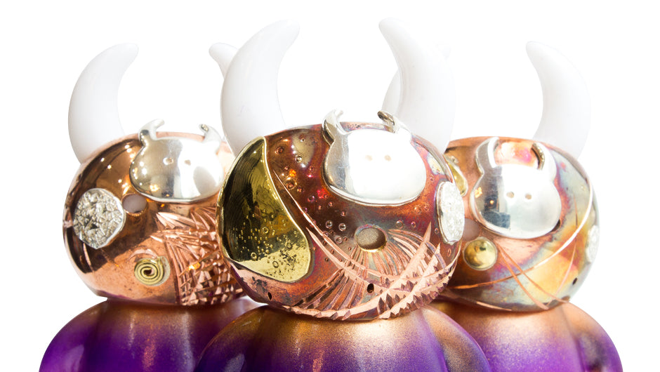 Minoru Takagi (Papamou) is a jewellery artisan and besides assembling all of our bag straps, keychains and even setting the eyes of every single Uamou soft vinyl character, he has also made a collection of Uamou jewellery consisting out of diamond and zircon set silver brooches, necklaces and rings. His trademark Uamou masks are carefully handmade and hammered in to shape. Each mask features a different design and is either set with stones, decorated with hand chiselled patterns, treated with fire to give the copper different color hues or it features a combination of these techniques. This makes each mask a truly unique piece and have become very popular and sought after among our fans.