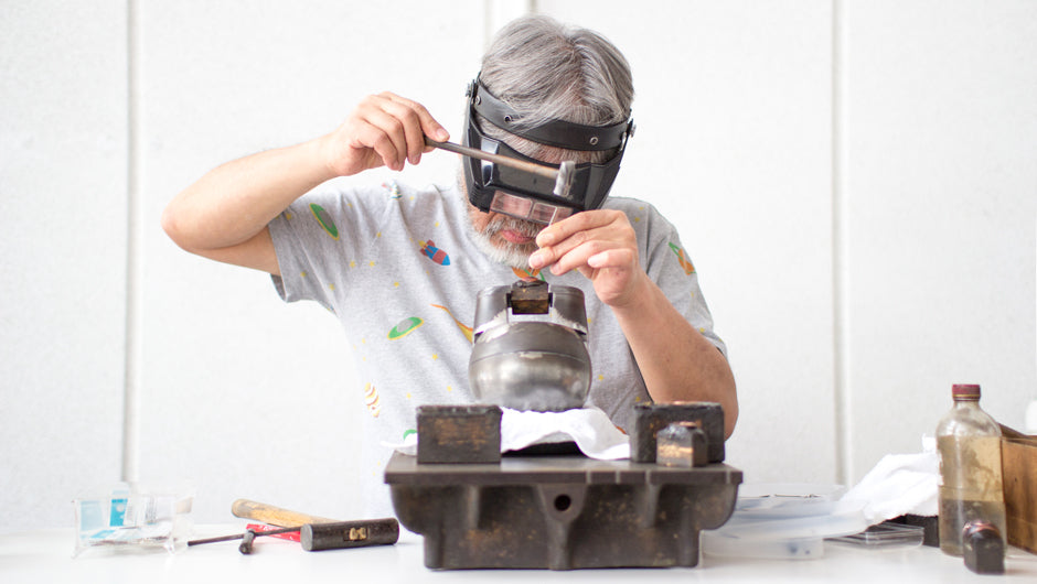 Not so much for his exhibition though, for which he has crafted an initial set of 55 copper masks that are made to snap onto the MASK UAMOU figures, an additional 8 large masks for the GALAXY REAL UAMOU (hand painted by Master Goto) and 20 copper winged SERAPH MINI UAMOU. The masks are carefully handmade and hammered in to shape. Each mask features a different design and is either set with stones, decorated with hand chiselled patterns, treated with fire to give the copper different color hues or it features a combination of these techniques. This makes each mask a truly unique piece and the entire collection is a sight to behold.