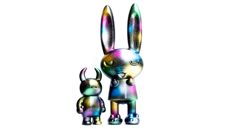 Standing at 6″ tall, each participating artist has customized a blank figure to be displayed in Clutter’s Gallery space. Studio Uamou has produced a particular 2 piece set with both the Bed Time Bunny and Uamou in a very particular galaxy colour-way painted by Master Goto.