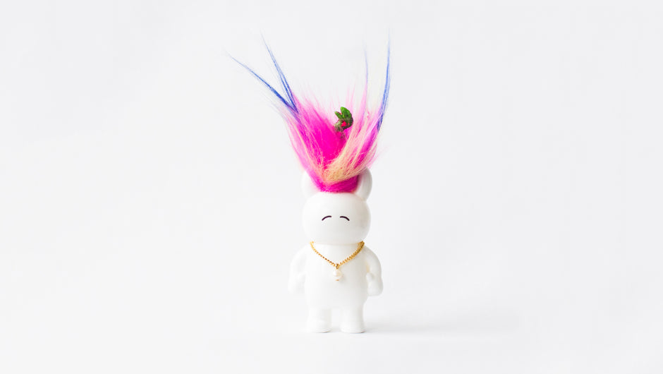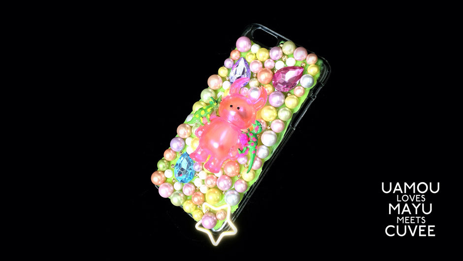 Mayu’s cute and colourful designs are juxtaposed to her love for savage dinosaurs. Incorporating Raptors and Tyrannosaurs in her arrangements of pearls and stars make for a very fun and fresh aesthetic. Mayu has created 16 customised Uamou figures and a series of Mayu meets Cuvee accessories featuring Uamou and Boo. Also you will be able to order custom made iPhone cases that are guaranteed to make people in the streets look twice.