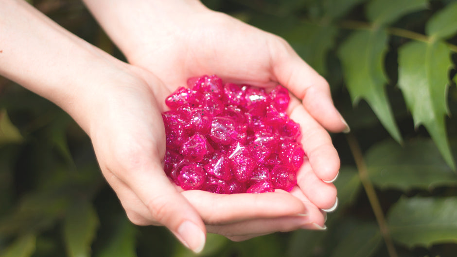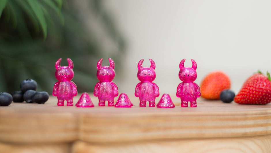 クリアピンク成型にラメが入ったフランボワーズ色のミニUAMOUとミニおばけちゃん。