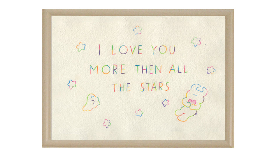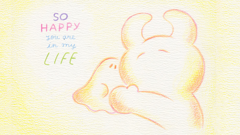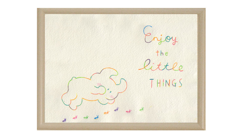 淡色系を中心にカラフルな色鉛筆で描かれた作品は、こどもの頃の記憶を甦らせるような、懐かしい感覚を見る人に呼び覚ませるような表現がされています。そしてそれぞれの絵には、シンプルながらも心に突き刺さる言葉が添えられています。