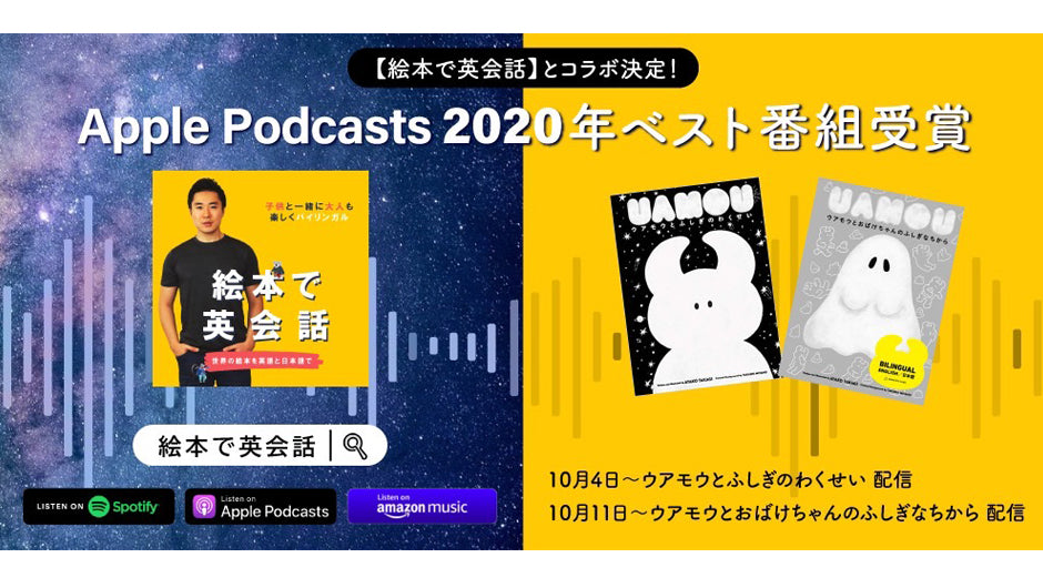 Apple Podcast の 2020年ベスト番組にも選出されたポッドキャスト『絵本で英会話』と、UAMOU絵本シリーズのコラボレーションが実現いたしました!