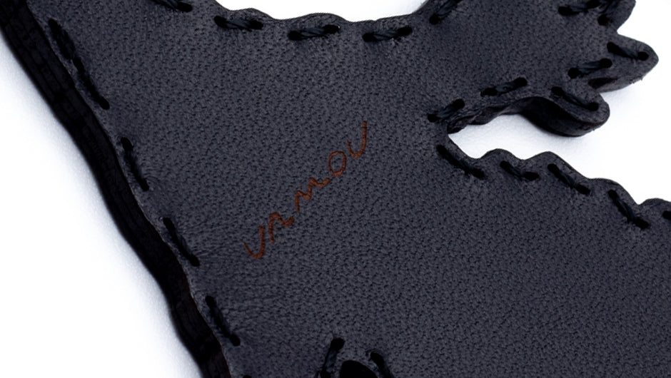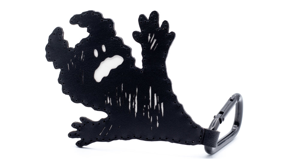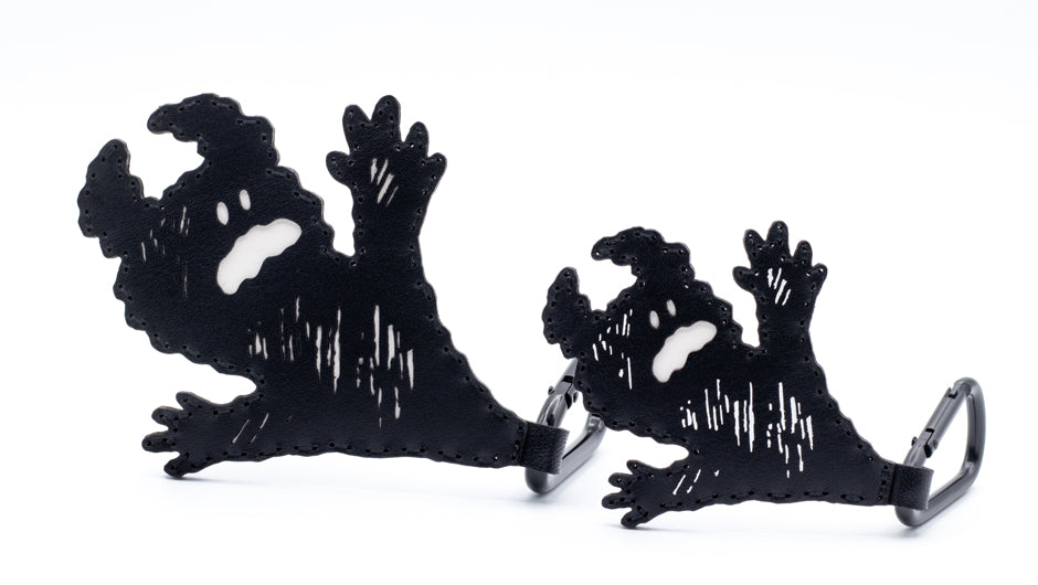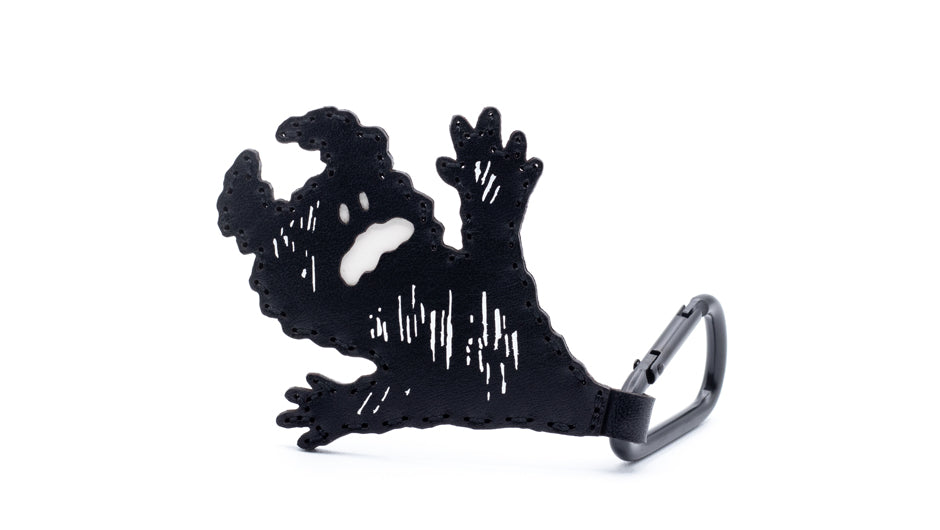 「シャドウ」を象った2枚のレザーを丁寧に貼り合わせ、同色の黒糸で縫い合わせました。表情や模様は、プリントではなく表側の革を切り抜き、下に重ねた革の白色をのぞかせた奥行のある仕上がりです。