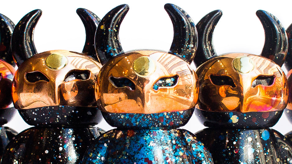 “Shadow Mask” is a limited series of 14 Masked Uamou from the mind of Minoru Takagi. The unique design of the copper masks are carefully hammered into shape and polished to a shine. Each mask has tiny individual details and are worn by a dazzling series of colourful Uamou painted by Master Goto . The Shadow Mask Uamou series will be offered exclusively via our Online Store starting February 2nd at 19:00 JST.