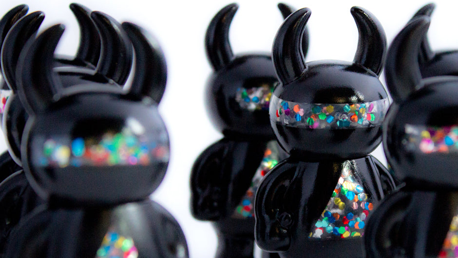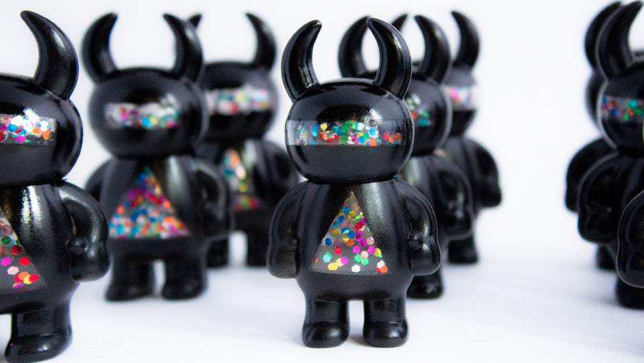 This week we will explore the immense body of work that is featured on the exhibition and we start today with a look at the elegant VOILLD UAMOU. This limited edition run of clear type Uamou have been painted solid black from the inside. Each figure has been decorated with different templates leaving parts of the head and body unpainted. The colourful triangle shapes in combination with the black finish commemorates our collaboration with Gallery VOILLD and will therefore have a special place in our hearts.