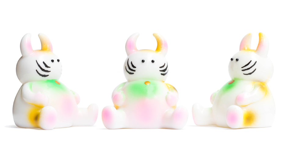 桃饅のような柔らかい緑とピンクの組み合わせに、三毛猫色を吹き付けたソフビは、まるで磁器のような仕上がりです。ほんのりピンクのお腹は思わずつつきたくなる可愛さ!