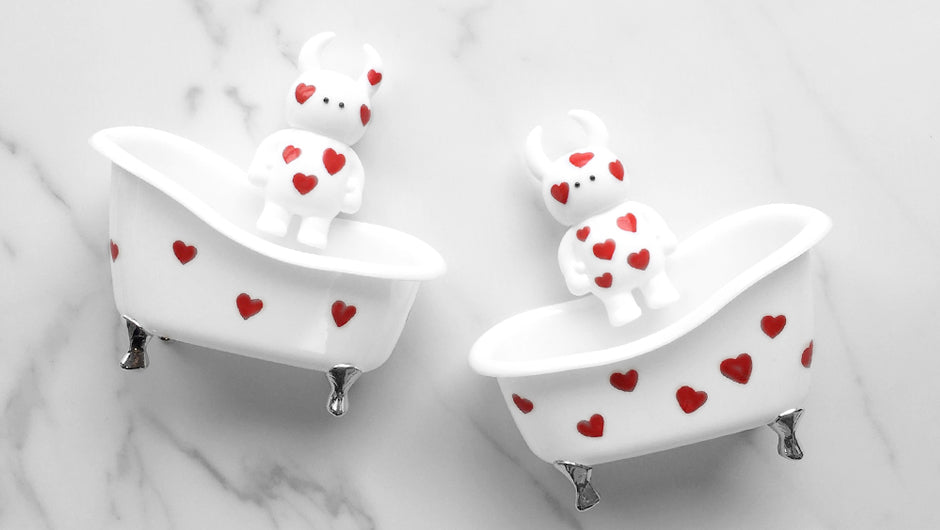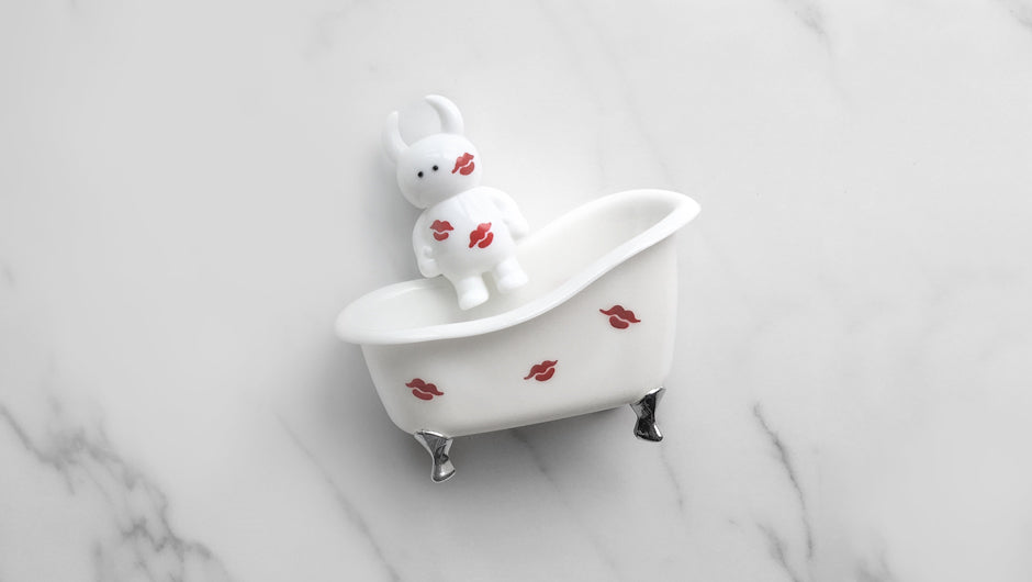 The Tiny Arts Exhibition is born from the concept of displaying contemporary Japanese artworks within the confined space of 60 cm3. Studio Uamou has created an original series of Bath Time Uamou displayed in adorable little bathtubs and the colourful Bubble Uamou, both carefully hand painted by Takagi Ayako.