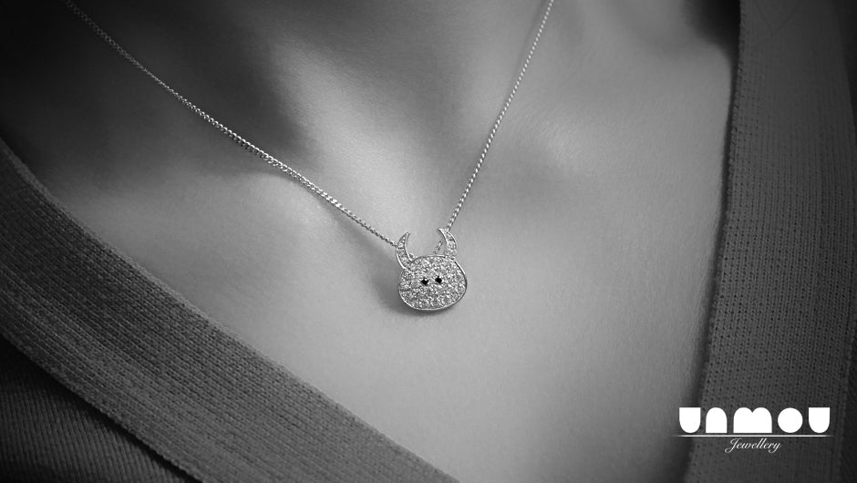 UAMOUの目にはブラックダイアモンドが留められていて、ロジウムメッキの加工が施されています。