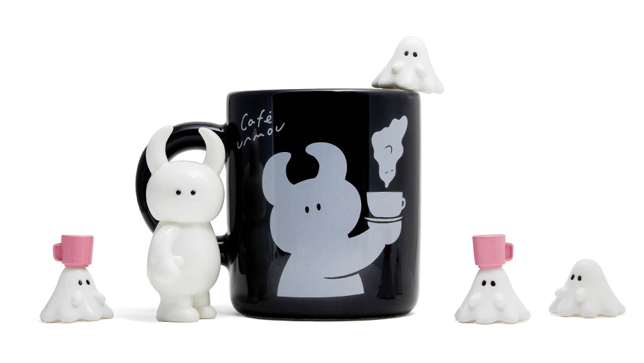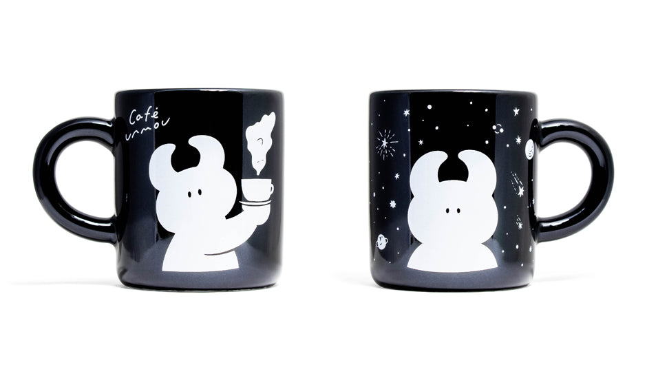 It might be surprising but this is the first mug we made. It features compact black body with a round handle and the artworks printed on its front and back were based on the Café UAMOU's key visual and picture book's cover illustration.