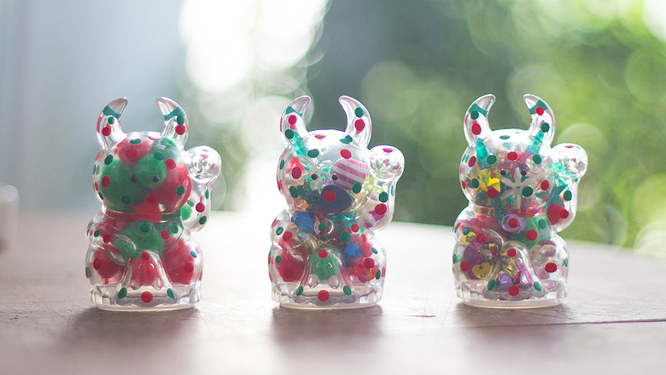 Be sure to brush your teeth kids because starting today you will be able to find a limited run of Xmas Candy Fortune Uamou which will be exclusive to Kaiju Blue! These colourful Fortune Uamou are filled with sparkling bijoux and handpainted on the outside by Ayako Takagi in a classic xmas dot pattern. Only 6 will be available so that means you must have been a really good kid if you will find one under the christmas tree this year!
