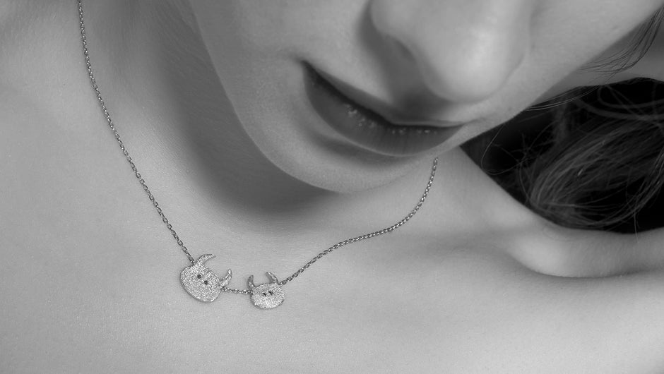 Designed by Ayako Takagi and hand-crafted by her father, the collection of Uamou Jewellery is timeless and elegant. All pieces are made in rhodium plated silver. The Necklace is decorated with Ruby and Saphire Eyes and the ring features two black diamonds. Made in Japan, these items come forth out of decades of craftsmanship and will make for an elegant gift or tasteful accessory on any occasion.