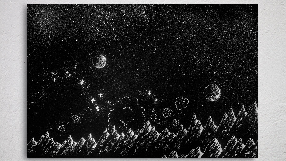 The two panels together create an impressive panorama featuring Mr, Nobody, Uamou and Boo set in a mysterious landscape and a star filled-sky.