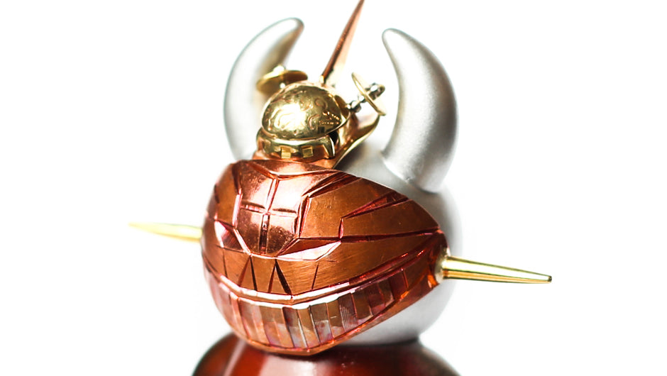 The Mazinger Z masked Uamou is part of the long running Masked Uamou series created by Master Craftsman Minoru Takagi. Even within the masked series this particular entry is quite particular. The masked is shaped in a rectangular fashion accentuating the features of Mazinger Z. The mask is carefully hammered into shape and engraved in high detail including a tiny Hover Pilder resting on top of the mask.