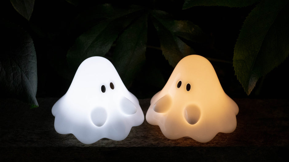 あたたかみのある電球色を含め16色に光る、『おばけちゃん虹色ランプ』の2つのタイプをご用意いたしました。