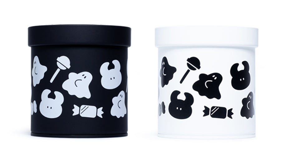 Canister: [diameter] 82mm x [height] 90mm / Screen Print on Side, Pad Print on Lid / comes with a plastic inner lid
