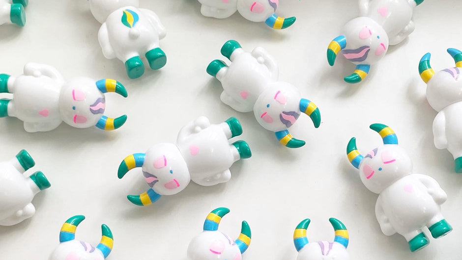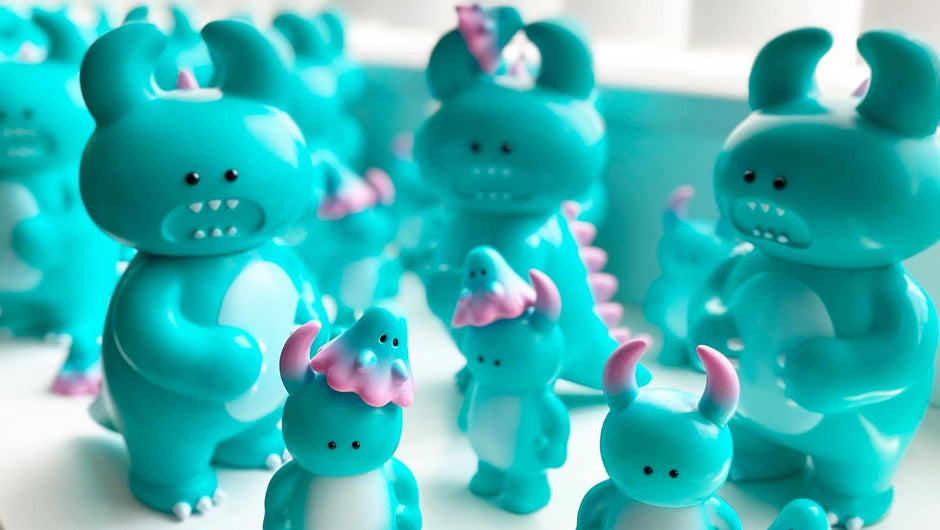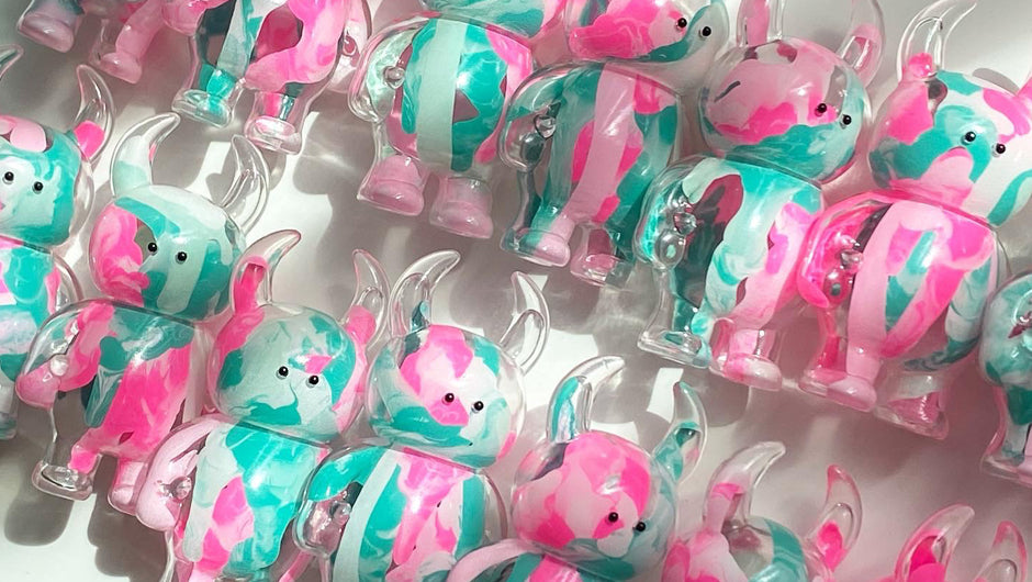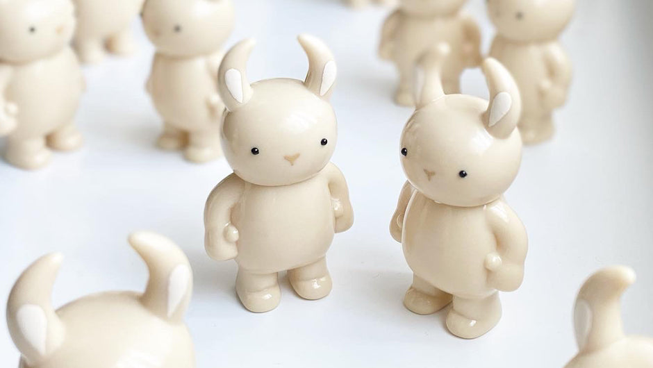 It is a great honour to be invited to ToyCon UK, which is celebrating its 10th anniversary! This is our first time attending the event, and will also be Ayako Takagi's first visit to London since graduating from college in the city. As befits the occasion, we have prepared a variety of works using different techniques. The key colours common to most work, are derived from TOYCONOSAURUS, the mascot of the event. Don't miss the limited colour of Rabbit UAMOU, which looks a lot like THAT rabbit associated with the UK!
